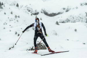 クロスカントリースキーで滑走しながら、途中でライフル射撃を行い、合計タイムを競う冬季スポーツです。